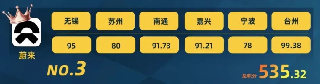 NIO surged from 12th in September to third in November, adding 133.99 points for a total of 535.32 (89.22 average). The jump coincided with the exclusion of its worst-ever result—43.39 in Nanjing—and the inclusion of its best-ever: 99.75 in Taizhou. Four of its six counted rounds now exceed 90 points, a marked improvement over mid-year results.