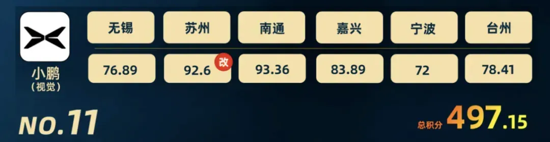 Avatr retained first place despite weak results in Nantong, Jiaxing, and Ningbo—where limited NOA-enabled road segments reduced its Ningbo score to 69.62. The removal of earlier high scores from Nanjing (100.88) and Changzhou (98.26) lowered its cumulative total by 24.52 points versus September. But in Taizhou, it posted 107.18 in prelims and 102.81 in finals, the only brand to break 100 in both stages, securing its lead.