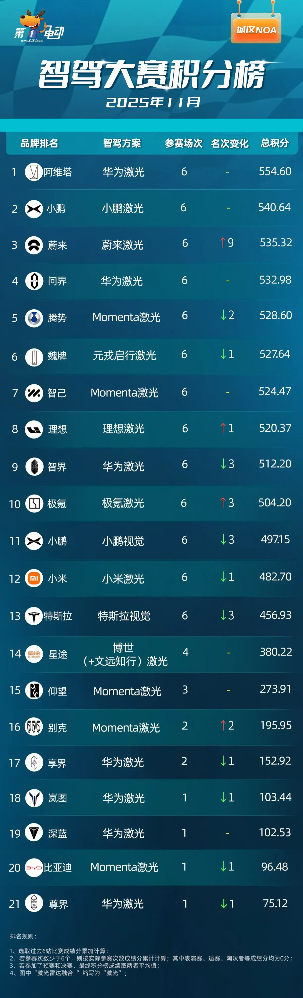 China’s national smart-driving competition organised by D1EV.com released its latest rankings after the October 26, 2025 Ningbo round and the November 29–30, 2025 Taizhou round, with Avatr, XPeng’s (NYSE:XPEV) LiDAR variant, and NIO (NYSE:NIO) occupying the top three positions.