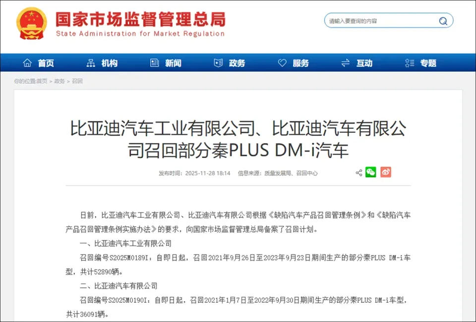China’s State Administration for Market Regulation (SAMR) announced on November 28, 2025, that it had ordered BYD (HKG:1211) to recall 88,981 Qin PLUS DM-i vehicles produced between 2021 and 2023 due to battery pack consistency defects. The issue involves variation in the behavior of individual cells within the battery pack, which can result in reduced pure-electric driving range and potential power interruption during operation.