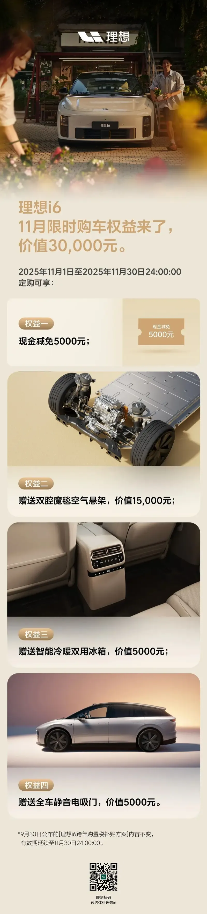 Li Auto has introduced limited-time purchase benefits for its Li i6 electric SUV, valued at up to 30,000 CNY (c. $4,200), available for orders placed between November 1 and 30, 2025.