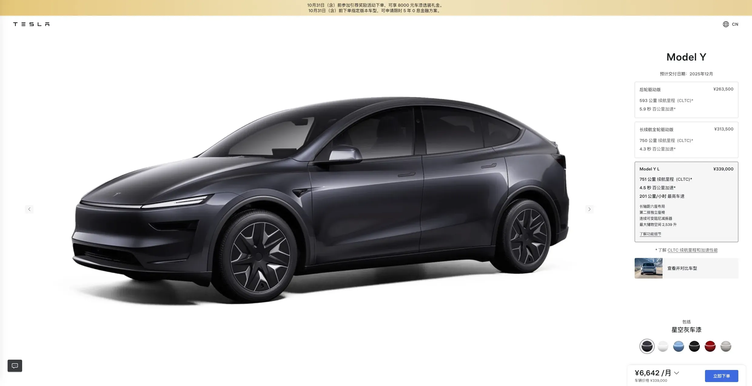 The base price is 339,000 CNY (c. $47,600) and Tesla offers limited-time incentives: an 8,000 CNY paint option credit for referrals and a 3-year 0% financing plan for orders placed before October 31.