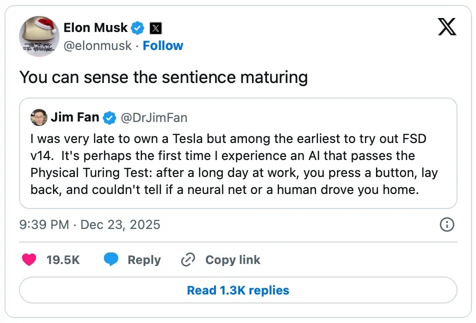 NVIDIA Director of Robotics Jim Fan has publicly stated that Tesla’s Full Self-Driving (Supervised) system version 14 is the first artificial intelligence to pass what he termed the “Physical Turing Test.” His comments came in late December 2025, following hands-on experience with Tesla’s FSD v14.
