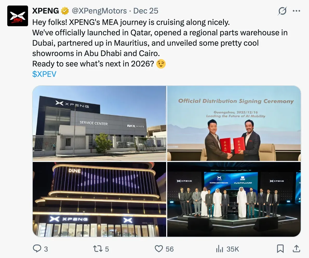 Earlier in December, Xpeng entered Mauritius through a strategic partnership with Axess Limited. The agreement marked the company’s first step into East Africa. Mauritius serves as both a tourism economy and a transit hub linking Africa, Asia, and the Middle East, offering access to nearby East African and Indian Ocean markets. Xpeng said the cooperation would help the company understand user expectations in markets with differing regulatory and operating environments.