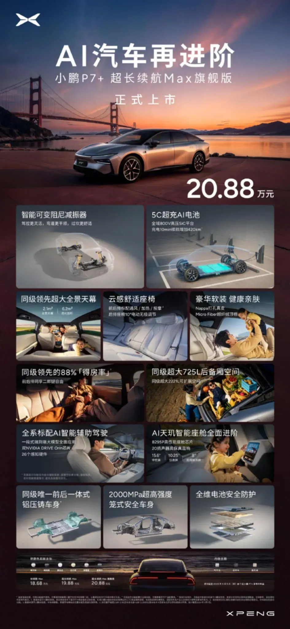On April 23, 2025, XPeng officially unveiled the P7+ Super Long Range Max Flagship Edition at the 2025 Shanghai Auto Show, priced at 208,800 RMB.