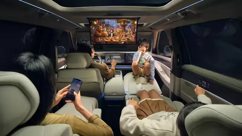 Inside, nine screens are networked across the cabin, including a 15.6-inch dual ultra-high-definition front display, a 21.4-inch foldable ceiling screen for rear occupants, and three Smart Surface hidden panels embedded in interior trim that activate on demand.