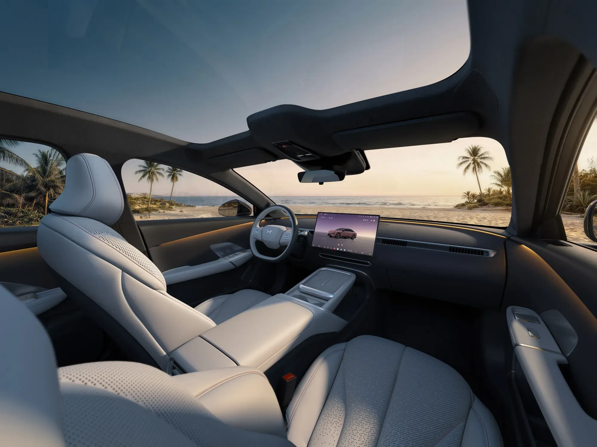 The cockpit runs XPeng's Tianji AIOS 6.0 system on an MT8676 chip with 24 GB of RAM, driving a 15.6-inch 2.5K central display. An industry-first nationwide 3D lane-level navigation system supports seamless 3D/2D switching with junction guidance and beyond-line-of-sight hazard warnings.